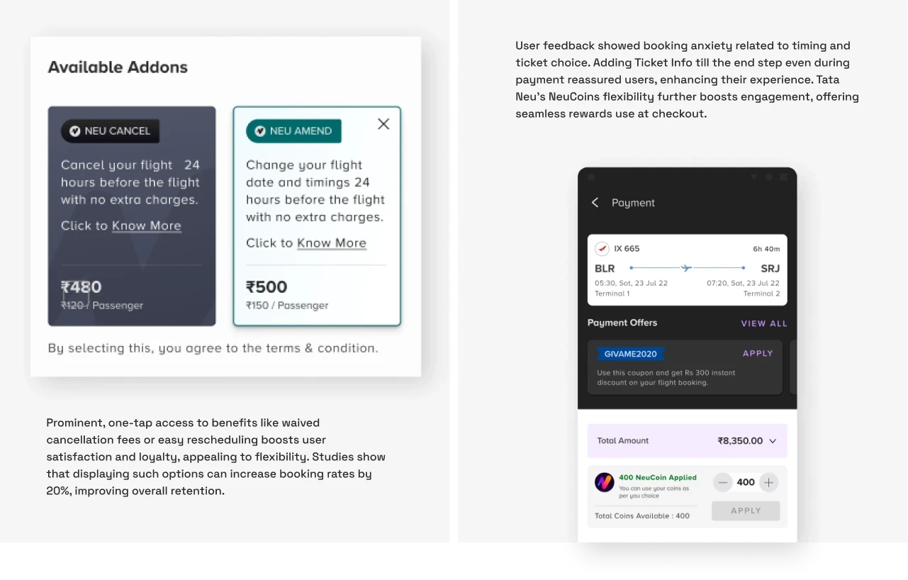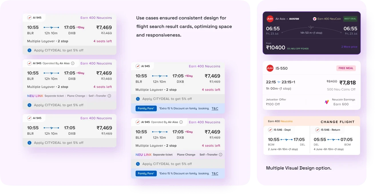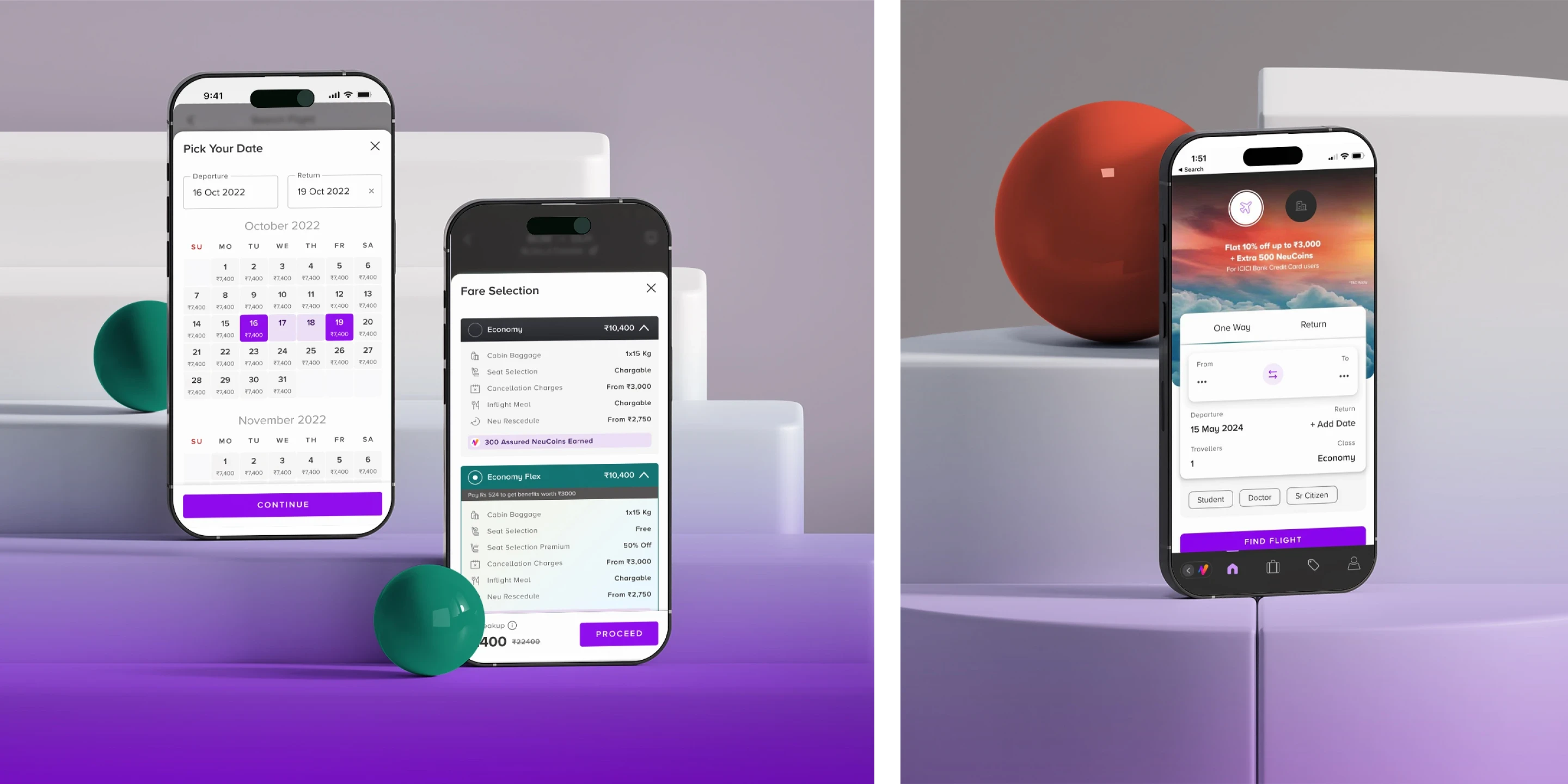 I contributed to TataNeu's End-to End flight booking experience and integrated designs for 35M* Neu Pass rewards members while aiding Product development.
