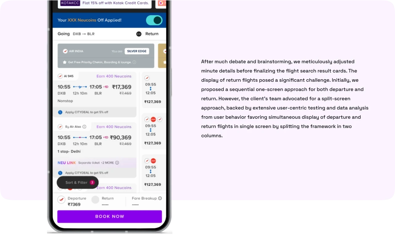 Honing the flight search was tricky. Balancing business data needs with user-friendliness, we explored countless layouts. User research led the way: a split-design with key info was finalized.